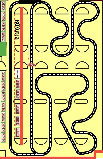 Némelyek suhannak, mások kattognak - elég vegyes képet mutat a mezőny. Tovább fogyatkoznak a küzdők, a 7-es (Lezs-Air) és a 9-es (SZE AIR SOFT) rajtszámú jármű is kijött a boxba. Úgy tűnik, nem jó ómen az "air" szócska szerepeltetése a névben (hárman már "boxoltak", egyedül SZE-Air-Kó van versenyben). Prüntyőke (12-es) közben másodszor jár a boxban. Alább közöljük a pályarajzot: